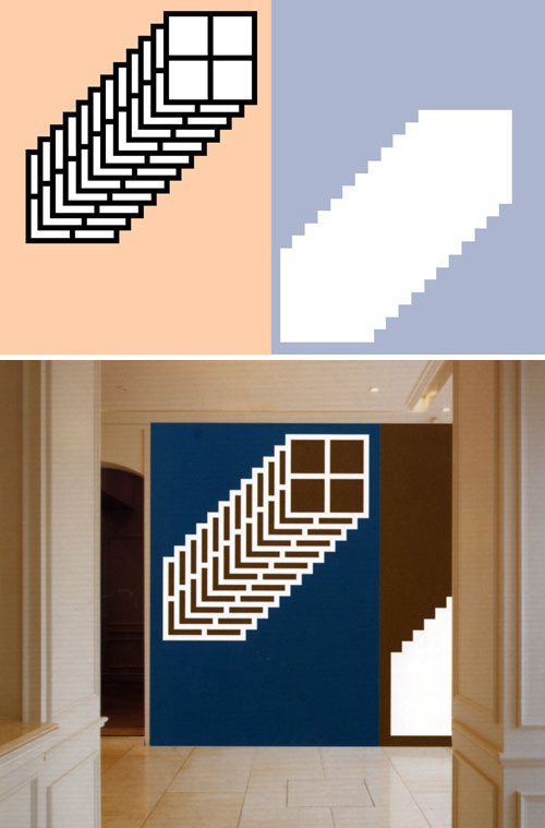 벽면을 가로로 이등분하여 왼쪽은 살구색, 오른쪽은 흰색으로 채색한다. 주어진 비례에 맞추어 양쪽 면에 (왼쪽은 중심을 기준으로 상단에, 오른쪽은 하단에) 각각 슬라이드를 투사하여 이미지 안에 하늘색 페인트를 칠한다. 마지막으로 왼쪽 이미지의 선을 따라 검은 페인트로 채색한다. 벽면의 비례가 변경될 경우에는 창문 형태의 위치만 고정시키고 나머지 면은 페인트로 채색한다. 3가지 색상 중에서 선택할 수 있다.
