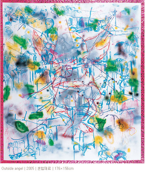 그것은 매일 같을 수도 있지만 매 시간 달라질 수 있는 우리 자신의 심리적 상태일 수도 있고, 현상적 모습과 정신들이 뒤얽혀 있는 환경이자 술에 취해 꿈꾸는 이상일 수도 있다. 이처럼 동시에 많은 것들이 얽혀있고 충돌하는 공간들을 통해 나는 강하고 거칠면서도 한편으로는 부드러울 수 있는 이중적인 에너지와 숨쉬고 있는 듯한 생명력을 드러내고자 한다.