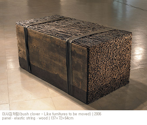‘나뭇가지 작업’에 대한 또 다른 관점으로서는, 나무라는 재료가 지닌 물성을 부각시키는 작업으로 이해하는 관점이 있을 수 있다. 사실 무수하게 쌓여 있는 싸리나뭇가지들의 단면들을 가까이서 응시하다 보면 잠시 그러한 ‘물성의 미학’에 몰입되어버리는 우리 자신을 발견할 수 있다.